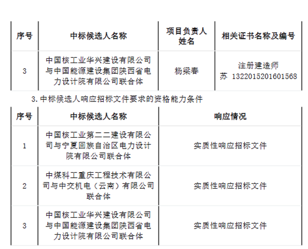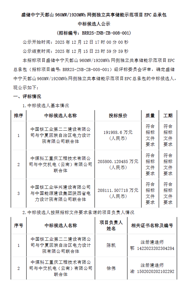 储能中国网获悉,日前,盛储中宁天都山960MW/1920MWh网侧独立共享储能示范项目发布EPC总承包中标候选人公示。中国核工业第二二建设有限公司、宁夏回族自治区电力设计院有限公司联合体以投标报价191988.6万元预中标。 据悉,招标人盛储新能源(中宁县)有限公司,为国有企业中国健康产业投资基金旗下控股单位,此次招标项目建设资金来源为企业自筹,出资比例为100%。项目工期不超过240天。 中标候选详情如下: 第一中标候选人:中国核工业第二二建设有限公司、宁夏回族自治区电力设计院有限公司联合体,投标报价191988.6万元,折合单价1.000元/Wh; 第二中标候选人:中煤科工重庆工程技术有限公司、中交机电(云南)有限公司联合体,投标报价205800.120485万元,折合单价1.072元/Wh; 第三中标候选人:中国核工业华兴建设有限公司、中国能源建设集团陕西省电力设计院有限公司联合体,投标报价208111.507718万元,折合单价1.084元/Wh。 根据招标公告,项目招标人为盛储新能源(中宁县)有限公司,项目位于宁夏中卫市,总规模960MW/1920MWh,配套建设 330kV 升压站1座,以1回 330kV 线路接入中宁天都山 750kV 变电站。 招标范围包括但不限于:配合发包人进行合规性手续办理及专项报告编制和审批;项目建设管理和协调;方案设计、初步设计、施工图设计以及竣工图设计;全部设备和材料的采购、运输和保管;所有建筑施工和设备安装(含储能区、330kV升压站、330kV送出线路以及对侧间隔)、设备调试和试验、系统调试及试运行、达标投产;验收(含环保验收(含电磁辐射)、水保验收、消防验收、并网手续及验收、涉网试验、实测建模及档案验收等各专项验收;阶段性验收;竣工验收等)、消缺、培训、移交生产、性能质量保证;全站外接备用电源;工程质量保修期限的服务;办理工程保险、档案移交等内容。 公示文件见下: