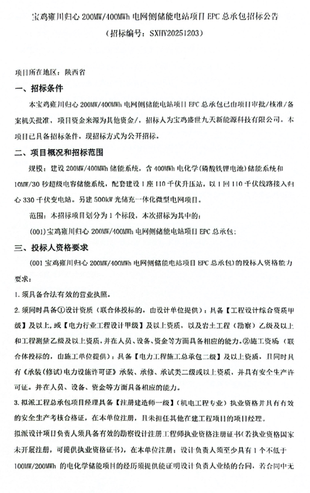储能中国网获悉,2025年12月29日,宝鸡盛世九天新能源科技有限公司发布宝鸡雍川归心200MW/400MWh电网侧储能电站项目EPC总承包招标公告,项目所在地区为陕西省,项目资金来源为其他资金。 项目建设200MW/400MWh储能系统,含400MWh电化学(磷酸铁锂电池)储能系统和10MW/30秒超级电容储能系统,配套建设1座110千伏升压站,以1回110千伏线路接入归心330千伏变电站。另建500kW光储充一体化微型电网项目。 招标人宝鸡盛世九天新能源科技有限公司为陕西盛世九天新能源科技有限公司全资子公司,两者均隶属于陕西智业科技集团。 项目要求设计负责人须至少具有1个不低于100MW/200MWh的电化学储能项目的经历,须提供能证明设计负责人业绩的合同。 本项目允许联合体投标,须满足相关条件。 原文如下: