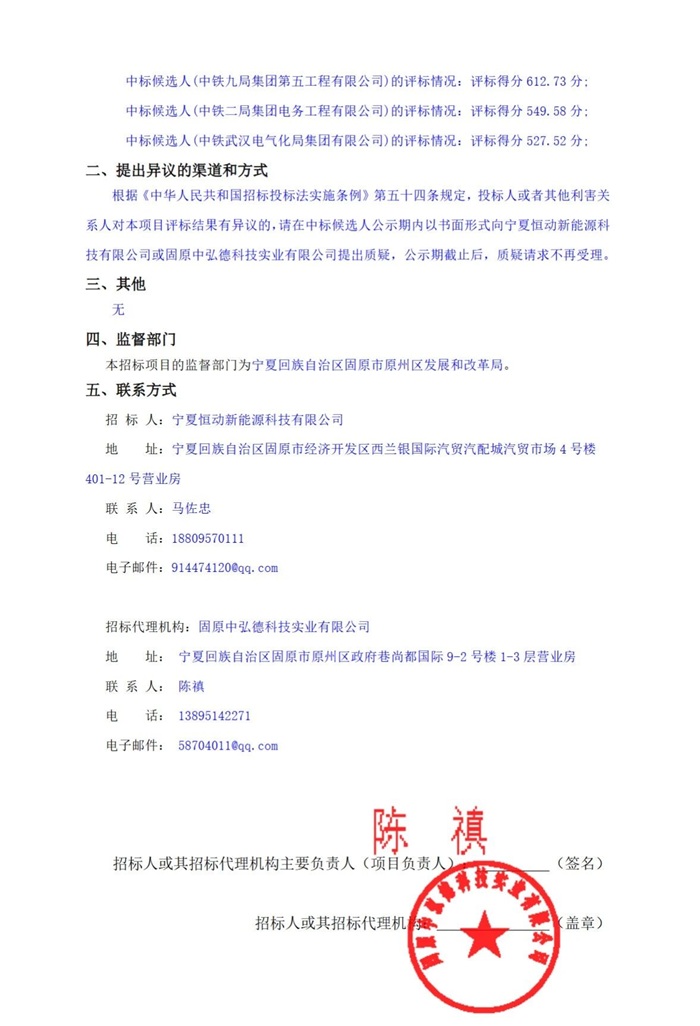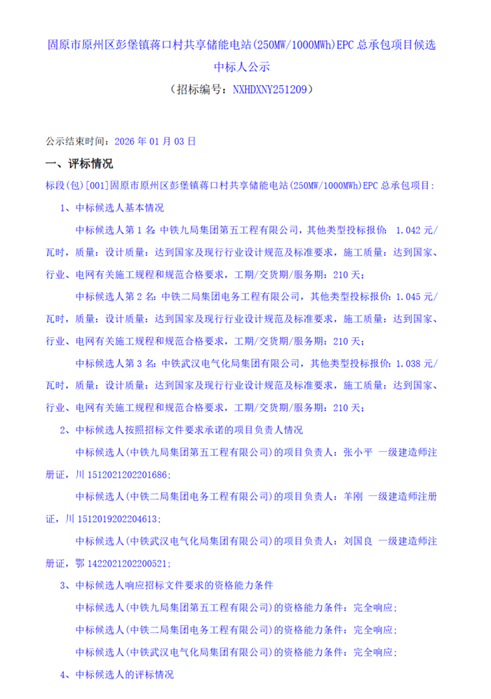 储能中国网获悉,日前,宁夏固原市原州区彭堡镇蒋口村共享储能电站(250MW/1000MWh)EPC总承包项目发布候选中标人公示。中铁九局集团第五工程有限公司以1.042元/Wh投标报价预中标。 候选中标人情况如下: 中标候选人第1名:中铁九局集团第五工程有限公司,投标报价为1.042元/Wh; 中标候选人第2名:中铁二局集团电务工程有限公司,投标报价为1.045元/Wh; 中标候选人第3名:中铁武汉电气化局集团有限公司,投标报价为1.038元/Wh。 根据招标公告,该项目发包人为宁夏恒动新能源科技有限公司,该项目总投资105000万元,建设资金来自发包人自筹和银行贷款组合模式,项目出资比例为100%。 招标范围为,储能变电站及其送出线路工程、330KV升压站的勘察设计、方案设计、施工图设计及各类专项设计;设备和材料采购、运输及储存;工程施工准备与施工、检查、验收、保修:设备安装与调试;项目试运行、消缺和成功通过试运行的初步验收;工程建设过程中的一切风险;工程竣工(含所有试验)验收、备案、移交以及质保期内的质量保证服务等;同时也包括工程消缺、材料、备品备件、专用工具、消耗品以及相关的技术资料和人员培训、工程过程中的协调等。 候选中标人公示原文如下: |