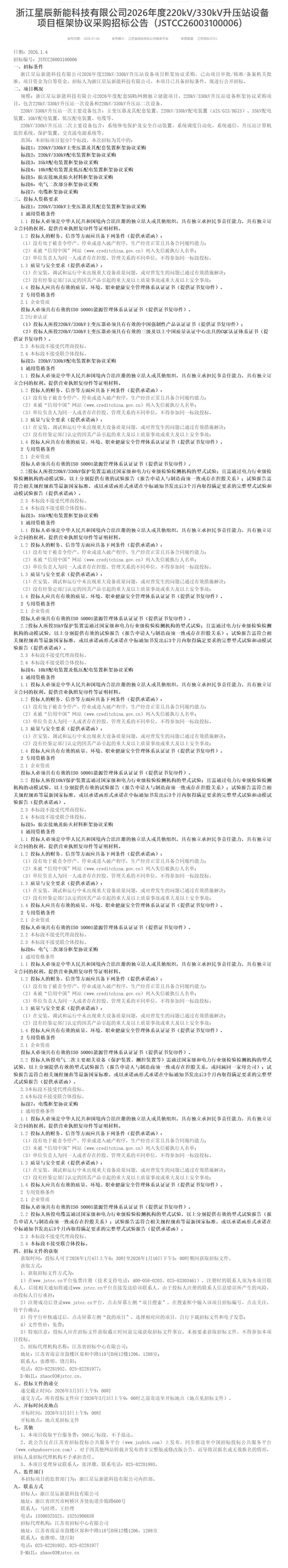 储能中国网获悉,1月4日,浙江星辰新能科技有限公司发布5GWh磷酸铁锂储能项目框架协议采购、800MWh全钒液流电池储能项目框架协议采购、220kV/330kV升压站设备框架协议采购招标公告。 各项目框采标段情况如下: 一、5GWh磷酸铁锂储能项目框架协议采购划分为6个标段 标段1:磷酸铁锂电池框架协议采购 标段2:直流侧集装箱体框架协议采购 标段3:BMS电池管理系统框架协议采购 标段4:直流侧液冷系统框架协议采购 标段5:储能消防系统框架协议采购 标段6:变流升压一体舱框架协议采购 二、800MWh全钒液流电池储能项目框架协议采购分为8个标段 标段1:集装箱组合(含箱内支架)框架协议采购 标段2:电解液循环泵框架协议采购 标段3:制冷机框架协议采购 标段4:电解液框架协议采购 标段5:离子交换膜框架协议采购 标段6:碳毡框架协议采购 标段7:双极板框架协议采购 标段8:变流升压一体舱框架协议采购 三、220kV/330kV升压站设备框架协议采购分为7个标段 标段1:220kV/330kV主变压器及其配套装置框架协议采购 标段2:220kV/330kV配电装置框架协议采购 标段3:35kV配电装置框架协议采购 标段4:10kV配电装置及低压配电装置框架协议采购 标段5:防雷接地及防火材料框架协议采购 标段6:电气二次部分框架协议采购 标段7:电缆框架协议采购 本次框架协议采购招标文件获取时间为2026年1月4日上午8:30时至2026年1月16日下午5:00。 招标公告原文如下: