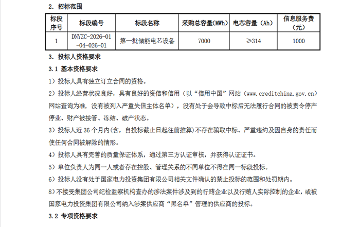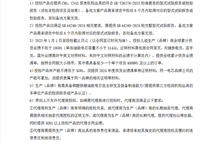 储能电芯设备专项资格要求: 投标人或生产(品牌)商全球累计供货业绩不低于 10GWh(单体储能电芯容量不小于 314Ah)。提供全球累计供货业绩清单,按照合同额大小排序,其中需具备至少一个单个项目 400MWh 及以上的订单。 投标产品年产能不得低于 5GWh,须提供 2024 年度供货业绩清单等证明材料;同一电芯品牌公司的产能可累加。 生产(品牌)商需具备磷酸铁锂储能电芯自主研发及装备制造能力(需提供第三方检测机构出具的本单位产品的检测报告或产品认证)。 储能系统设备专项资格要求: 投标人2022年1月至今(以合同签订时间为准),国内累计供货业绩不低于10GWh(合同业绩单体项目容量不低于5MWh,证明材料需包括合同首页、关键参数页、签字页),如业绩为框架合同请明确签订使用容量否则不予计入累计合同业绩。至少5个单体项目容量200MWh及以上的磷酸铁锂电化学储能系统并网业绩(证明材料需包括合同首页、关键参数页、签字页,以及投运证明或竣工验收证书等)。 招标公告原文如下:
