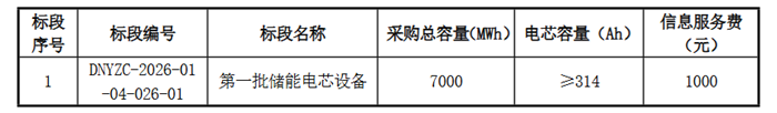储能中国网获悉,1月4日,国家电力投资集团有限公司发布2026年第一批储能电芯设备和第一批储能系统设备招标公告。本次集采储能电芯设备总规模7GWh,储能系统设备总规模5GWh。具体如下, 第一批储能电芯设备: 分为1个标段,采购总规模7GWh,电芯容量≥314Ah;