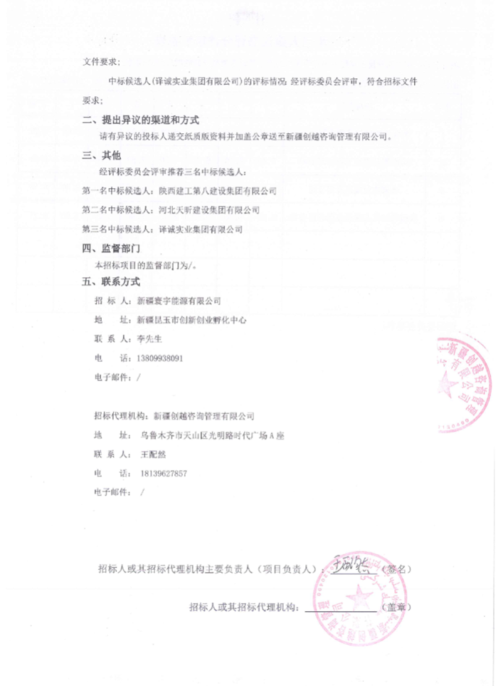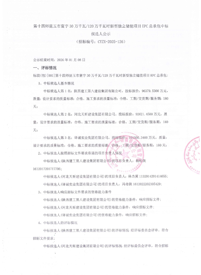 储能中国网获悉,2026年1月5日,第十四师昆玉市寰宇30万千瓦/120万千瓦时新型独立储能项目EPC总承包中标候选人公示。根据公示,陕西建工第八建设集团有限公司以96379.53万元投标报价预中标。 具体中标候选人情况如下: 中标候选人第1名:陕西建工第八建设集团有限公司,投标报价为96379.53万元,折合单价约0.803元/Wh; 中标候选人第2名:河北天听建设集团有限公司,投标报价为92621.45万元,折合单价约0.772元/Wh; 中标候选人第3名:译诚实业集团有限公司,投标报价为101500.34万元,折合单价约0.846元/Wh。 根据招标公告,该项目招标人为新疆寰宇能源有限公司,项目资金来源为自筹资金106017.483万元,折合单价0.883元/Wh。项目位于新疆生产建设兵团第十四师昆玉市,项目选址于昆玉市城西公安维稳检查站以西1公里处。计划新建30万千瓦/120万千瓦时电化学储能系统、储能单元采用2.5MW/10MWh 储能系统基本单元,采用集装箱式安装,配套新建1座220kV升压站,内设2*24MVA双绕组有载调压变压器。 中标候选人公示公告原文如下: