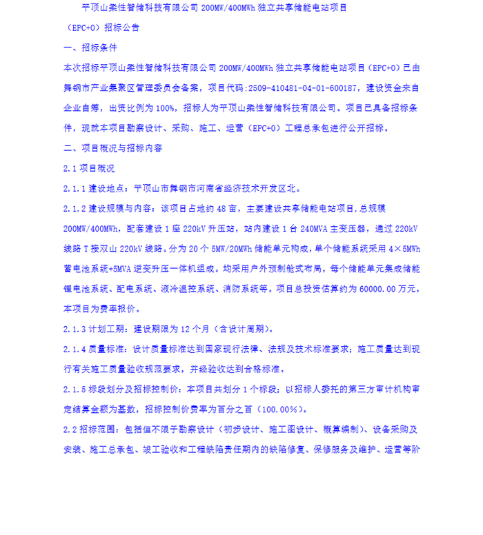 200MW/400MWh!平顶山独立共享储能电站项目EPC+O招标