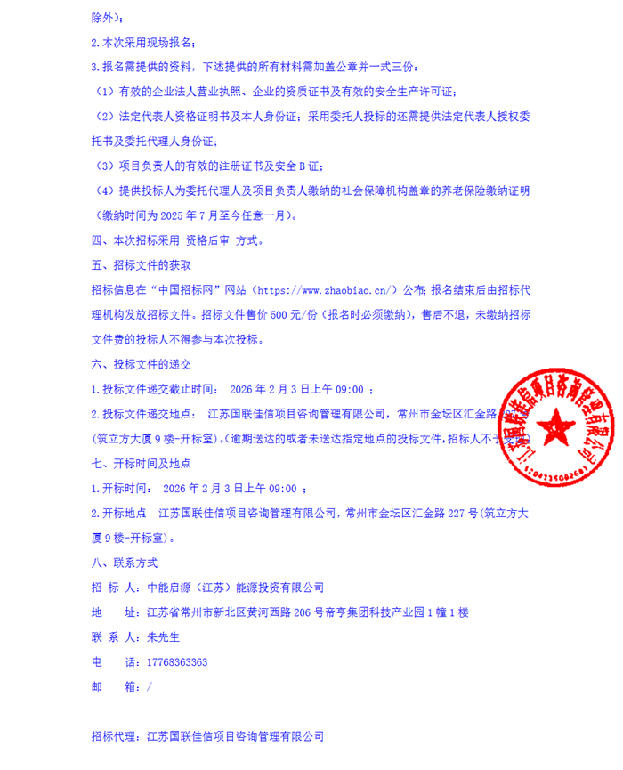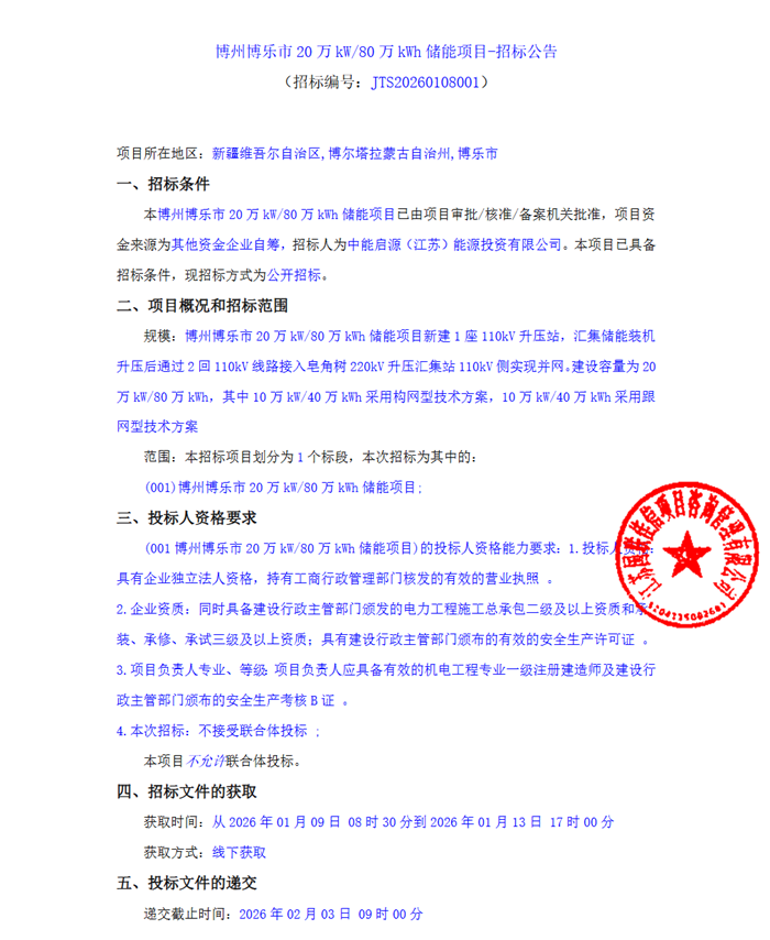 储能中国网获悉,1月8日,博州博乐市200MW/800MWh储能项目发布招标公告。招标人为中能启源(江苏)能源投资有限公司。该项目位于新疆维吾尔自治区博尔塔拉蒙古自治州博乐市,新建1座110kV升压站,汇集储能装机升压后通过2回110kV线路接入皂角树220kV升压汇集站110kV侧实现并网。 项目建设容量为200MW/800MWh,其中100MW/400MWh采用构网型技术方案,100MW/400MWh采用跟网型技术方案。 招标范围:新建200MW/800MWh独立储能电站一座,包括110kV升压站及储能场区,储能建设容量包括100MW/400MWh构网型储能系统,100MW/400MWh跟网型储能系统。 投标人资格要求:具备建设行政主管部门颁发的电力工程施工总承包二级及以上资质和承装、承修、承试三级及以上资质;具有建设行政主管部门颁布的有效的安全生产许可证。项目负责人专业、等级;项目负责人应具备有效的机电工程专业一级注册建造师及建设行政主管部门颁布的安全生产考核B证。 本项目不接受联合体投标。 原文如下: