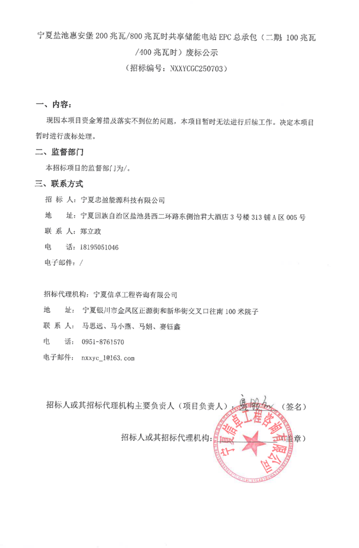 储能中国网获悉,1月14日,宁夏盐池惠安堡200兆瓦/800兆瓦时共享储能电站EPC总承包(一期、二期)废标公告。公告显示,因项目资金筹措及落实不到位的问题,暂时无法进行后续工作。决定本项目暂时进行废标处理。 据了解,该项目中标人为均为中铁二十一局集团运营管理有限公司,投标报价均为43000万元,折合单价为1.075元/Wh。项目招标人为宁夏忠盈能源科技有限公司。 原文如下: