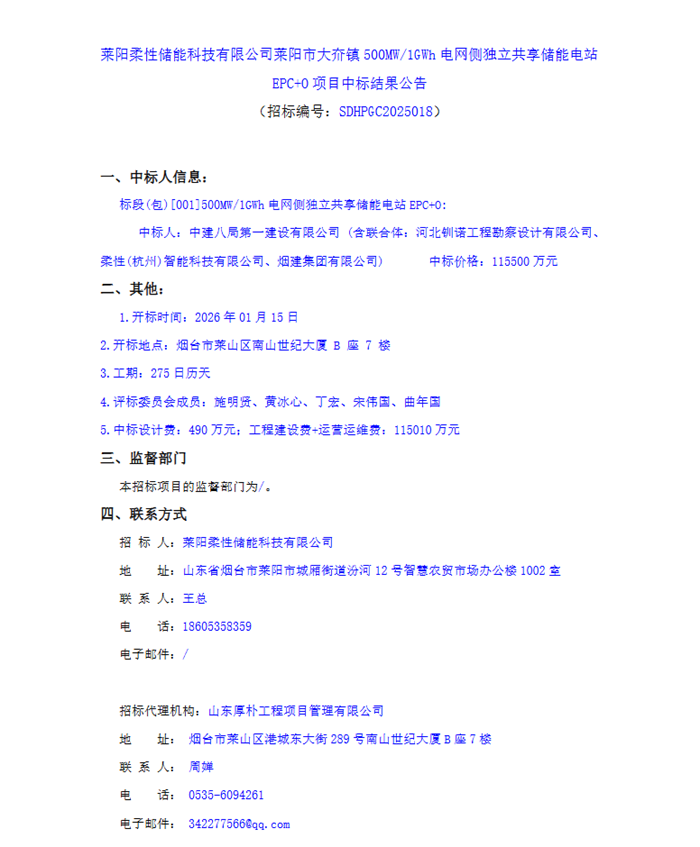 储能中国网获悉,1月19日,莱阳柔性储能科技有限公司发布莱阳市大夼镇500MW/1GWh电网侧独立共享储能电站EPC+O项目中标结果公告。中标人为中建八局第一建设有限公司(含联合体:河北钏诺工程勘察设计有限公司、柔性(杭州)智能科技有限公司、烟建集团有限公司)中标价格:115500万元。 原文如下: