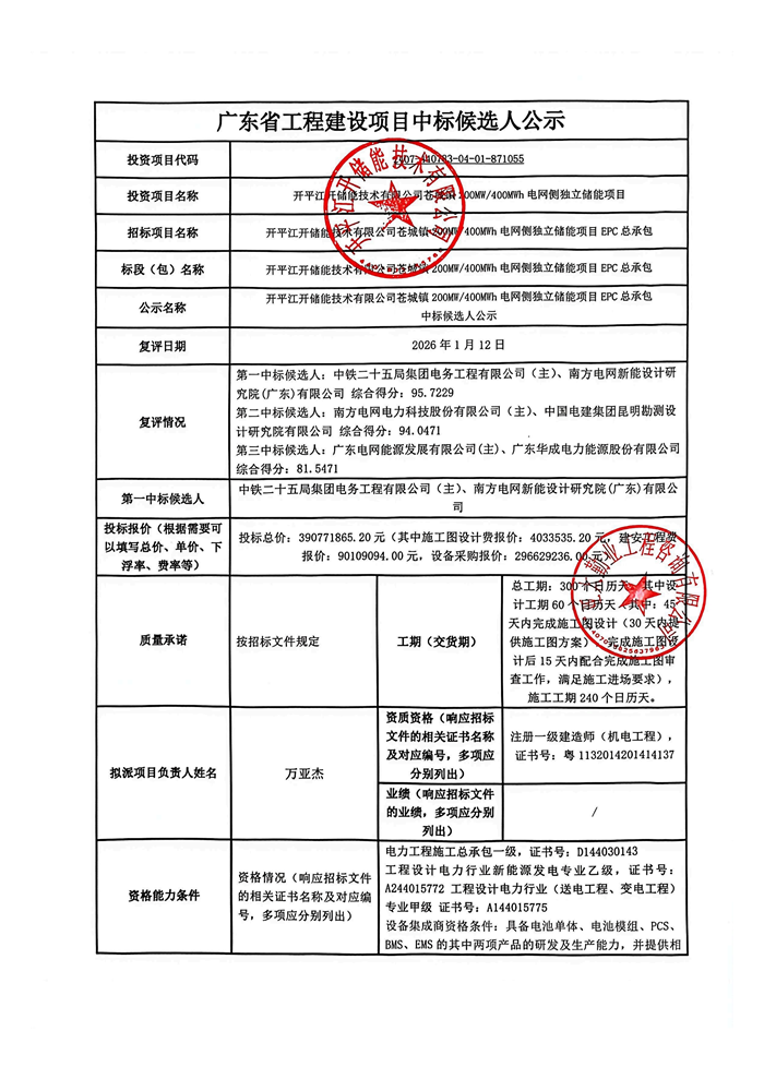储能中国网获悉,1月20日,江门市公共资源交易平台发布关于恢复“开平江开储能技术有限公司苍城镇200MW/400MWh电网侧独立储能项目EPC总承包”招投标活动和公示复评结果的通知。公告显示,中标候选人由南网科技与中国电建昆明院联合体变更为中铁二十五局与南方新能院。 2025年12月1日,招标人开平江开储能技术有限公司发布200MW/400MWh的电网侧独立储能项目EPC招标。该项目位于广东省江门市苍城镇内的220kV湾琴变电站东南侧,配套建设220kV储能升压站1座。招标要求设备集成商至少具备电池单体、电池模组、PCS、BMS、EMS的其中两项产品的研发及生产能力,并提供相关产品的第三方型式试验报告。 该项目于2025年12月29日发布中标候选人公示: 第一名为南方电网电力科技股份有限公司及中国电建集团昆明勘测设计研究院有限公司联合体,投标报价为38292.631366万元, 第二名为中铁二十五局集团电务工程有限公司与南方电网新能设计研究院(广东)有限公司联合体,投标报价为39077.18652万元、 第三名为广东电网能源发展有限公司与广东华成电力能源股份有限公司联合体,投标报价为38486.117804万元。 因在公示期间收到异议,2026年1月4日发布暂停本招标项目的招投标活动公告。直至1月20日,招标人发布恢复招投标活动,并公示复评结果。 调整后的结果显示,第一中标候选人由“南方电网电力科技股份有限公司(主)、中国电建集团昆明勘测设计研究院有限公司”,现变更为“中铁二十五局集团电务工程有限公司(主)、南方电网新能设计研究院(广东)有限公司”,这也意味着此次招标的最终中标价格从之前的38292.631366万元变更为39077.18652万元,单价约0.9573元/Wh变为0.9269元/Wh。 原文如下: |