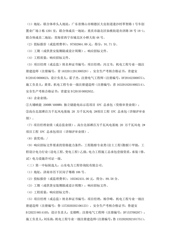 储能中国网获悉,1月22日,中国移动长三角(淮南)数据中心7MW-42MWh储能示范项目中标候选人公示。安徽华电工程咨询设计有限公司以投标报价1.0585亿元(折合单价约2.5203元/Wh)预中标。 中标候选人情况见下: 第一中标候选人:安徽华电工程咨询设计有限公司,投标报价105850884.00元,折合单价约2.5203元/Wh; 第二中标候选人:联合体牵头人:广东永光新能源设计咨询有限公司;联合体成员一:中规地环勘测设计有限公司;联合体成员二:中国电建集团青海工程有限公司,投标报价97502864.00元,折合单价约2.3215元/Wh; 第三中标候选人:山东电力工程咨询院有限公司,投标报价105362431.00元,折合单价约2.5086元/Wh。 根据招标公告,中国移动长三角(淮南)数据中心7MW-42MWh储能示范项目招标人为淮南皖能智慧能源有限公司,招标范围为主要工作内容(包括但不限于):7MW-42MWh全钒液流电池储能系统及场区场平(包含约4000平方储能应用场地及2000平方预留场地)、生产区、进站道路开口等设计,设备和材料采购、施工安装、整体系统调试、监控设备调试(满足皖能集团对场站监控的相关要求)、涉并网试验、消防验收、启动验收、并网、移交、外部协调、培训等。 本次项目招标合同估算价:107615379元,计划工期150日历天,从发包人发出书面通知之日起算。 中标候选人公示原文如下: