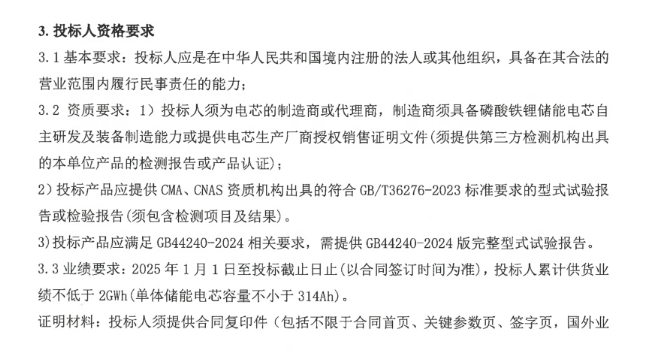 储能中国网获悉,2026年2月5日,南源储能发布2026年上半年度314Ah电芯框架集采供应商招标,拟采购一批磷酸铁锂电池(314Ah电芯),预估采购总容量2GWh。 据了解,招标人南源储能技术有限公司成立于2016年,是一家集碳酸锂、正极材料、铜箔、电芯、电池组研发、生产、销售于一体的研发型科技企业,专注于新能源电池上下游产业链。 本次集采要求投标人的单体储能电芯容量不小于314Ah一年内累计供货业绩不低于2GWh,其中需具备至少一个单个项目400MWh及以上的业绩。 本次集采不接受联合体投标。 原文如下: