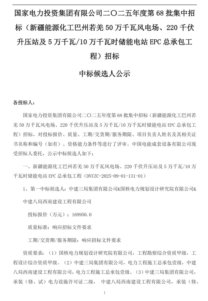 储能中国网获悉,2月9日,国家电力投资集团有限公司2025年度第68批集中招标(新疆能源化工巴州若羌50万千瓦风电场、220千伏升压站及5万千瓦/10万千瓦时储能电站EPC总承包工程)招标中标候选人公示。公示显示,中建三局集团有限公司&国核电力规划设计研究院有限公司&中建八局西南建设工程有限公司预中标! 中标候选人情况如下: 第一中标候选人:中建三局集团有限公司&国核电力规划设计研究院有限公司&中建八局西南建设工程有限公司,投标报价169950万元; 第二中标候选人:中国水利水电第四工程局有限公司&中国电建集团昆明勘测设计研究院有限公司,投标报价171476.9721万元。 根据招标公告,招标范围包括500MW风电场、50MW/100MWh储能电站、220kV升压站、2台调相机、35kV集电线路、进场道路、检修道路及附属设施等全部勘察设计工作。 原文如下: