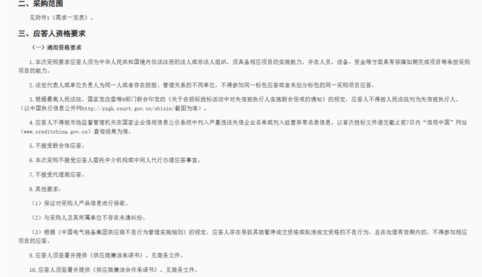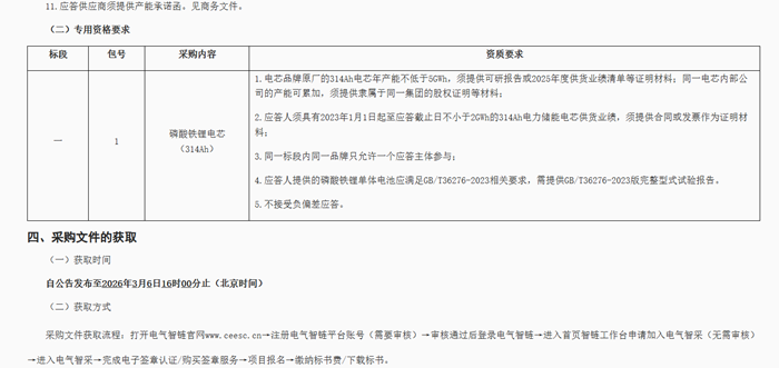 应答人资格要求如下: 电芯品牌原厂的314Ah电芯年产能不低于5GWh,须提供可研报告或2025年度供货业绩清单等证明材料;同一电芯内部公司的产能可累加,须提供隶属于同一集团的股权证明等材料。 应答人须具有2023年1月1日起至应答截止日不小于2GWh的314Ah电力储能电芯供货业绩,须提供合同或发票作为证明材料。 法定代表人或单位负责人为同一人或者存在控股、管理关系的不同单位,不得参加同一标包应答或者未划分标包的同一采购项目应答。 不接受联合体应答;不接受代理商应答。 公告原文如下: