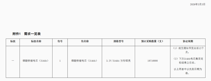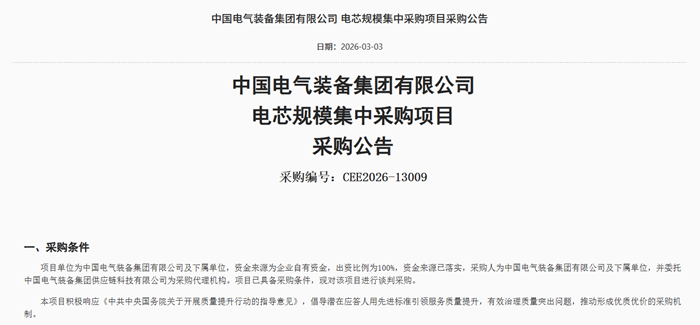 储能中国网获悉,3月3日,中国电气装备集团有限公司2026年电芯规模集中采购公告发布。此次规模集中采购涉及电芯1个项目,预计采购金额约69亿元。 根据公告,此次采购范围为磷酸铁锂电芯314Ah,预计采购19710000支,计算得总容量约为19.8GWh。
