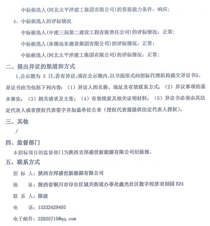 储能中国网获悉,3月9日,陕西省铜川市印台区80MW/240MWh独立电化学储能电站EPC工程总承包项目(二次)中标候选人公示。根据公示,中建三局第二建设工程有限责任公司以投标报价21560.00万元预中标。 中标候选人情况如下: 第一中标候选人,中建三局第二建设工程有限责任公司,投标报价21560.00万元,折合单价约0.8983元/Wh; 第二中标候选人,承德远东建设集团,投标报价19698.492460万元,折合单价约0.8208元/Wh; 第三中标候选人,河北太平洋建工集团,投标报价22012.76万元,折合单价约0.9172元/Wh; 原文如下: