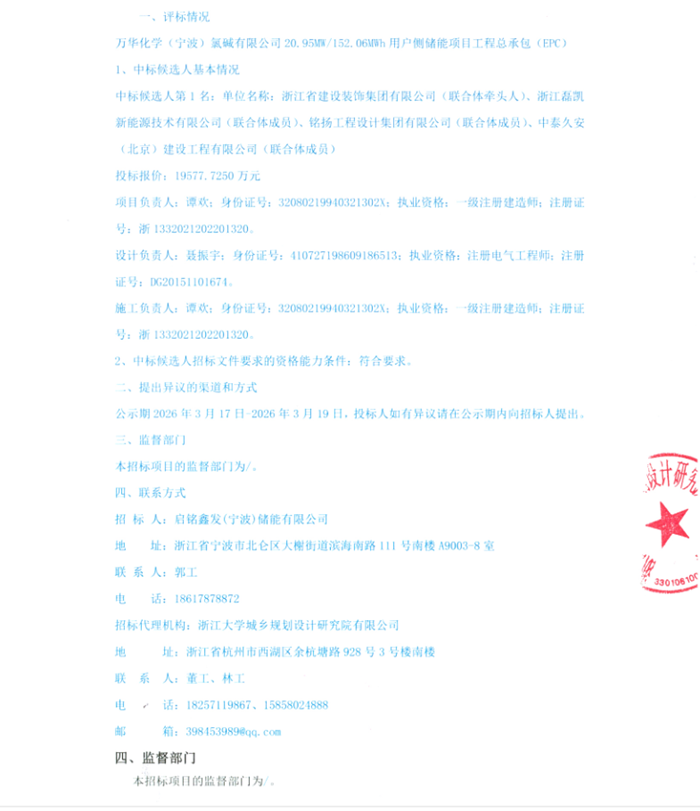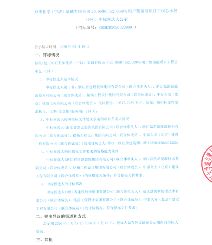 储能中国网获悉,3月16日,万华化学(宁波)氯碱有限公司20.95MW/152.06MWh用户侧储能项目工程总承包(EPC)中标候选人公示发布。公示显示,浙江省建设装饰集团有限公司等联合体以19577.725万元投标报价预中标。 根据招标公告,万华化学(宁波)氯碱有限公司20.95MW/152.06MWh用户侧储能项目招标人为启铭鑫发(宁波)储能有限公司,项目资金来源为自筹资金20071.92万元。 项目为新建用户侧储能项目,电力消纳客户为万华化学(宁波)氯碱有限公司。项目采用铅炭电池,利用峰谷电量进行充放电,储能单元由数字储能电池预制舱储能PCS升压一体舱并网预制舱组成,储能总装机功率20.95MW,装机容量为152.06MWh,包含66套2.304MWh电池储能单元、8套PCS升压一体舱、1套并网预制舱以相关附属设施、建构筑物等。 中标候选人公示原文如下: