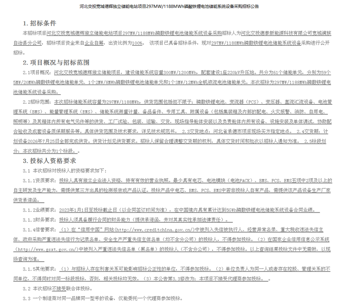 储能中国网获悉,河北交投宽城德辉独立储能电站项目发布297MW/1188MWh磷酸铁锂电池储能系统设备+3MW/12MWh全钒液流电池储能系统设备采购招标公告。项目招标人为河北交投德泰新能源科技有限公司宽城满族自治县分公司,招标项目资金来自企业自筹。 河北交投宽城德辉独立储能项目,建设储能系统容量300MW/1200MWh,配套建设1座220kV升压站。共分为61个储能单元,分别为59个5MW/20MWh磷酸铁锂电池储能单元、1个2MW/8MWh磷酸铁锂电池储能单元和1个3MW/12MWh全钒液流电池储能单元。 原文如下: