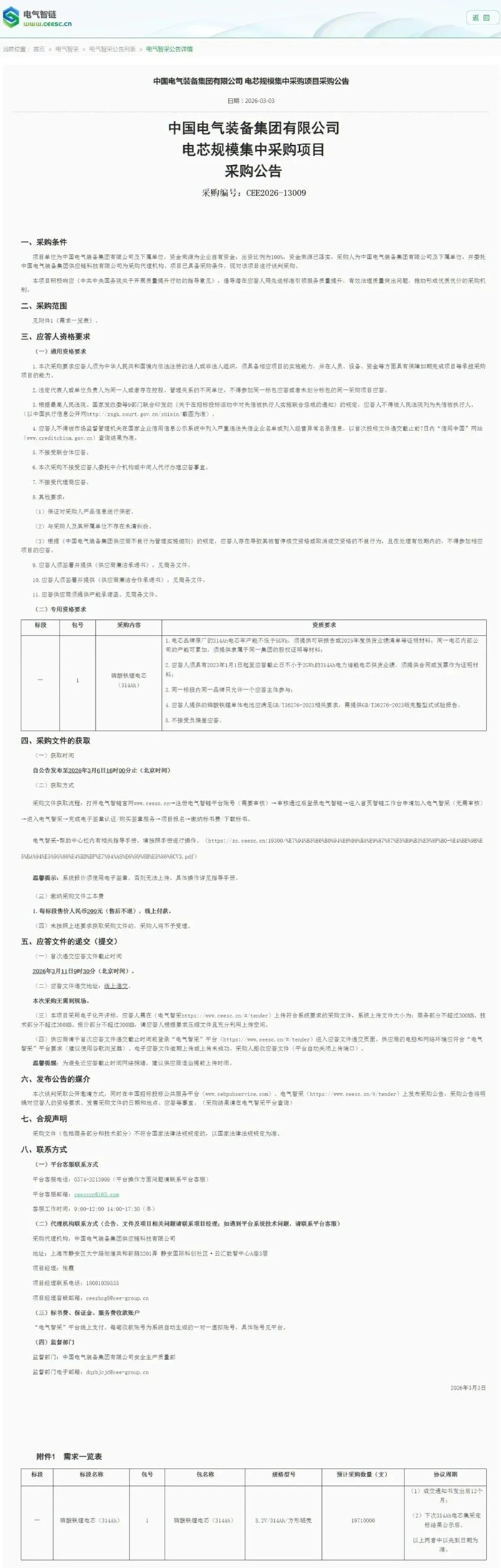 储能中国网获悉,3月25日,中国电气装备集团有限公司电芯规模集中采购成交人名单发布。公告显示,楚能新能源、鹏辉能源、海辰储能、亿纬动力、瑞浦兰钧、中汽新能、南都电源、青海鹏程无限、宁德时代、赣锋锂电、中创新航共11家供应商入围。据此前公告显示,314Ah磷酸铁锂电芯预计采购数量为1971万支,总容量约为19.8GWh。采购人为中国电气装备集团有限公司及下属单位。 原文如下: